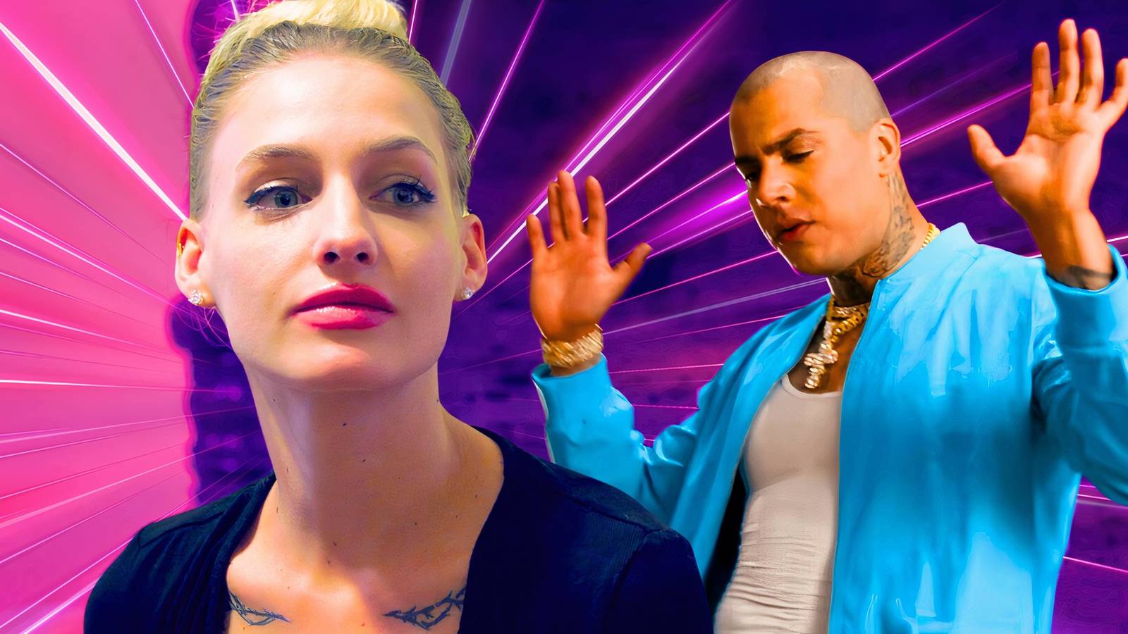 Морья Плат, звезда «Welcome to Plathville», в монтаже с бывшим партнером Мэтью Крэйвеном, с крестом и фоном в виде молнии