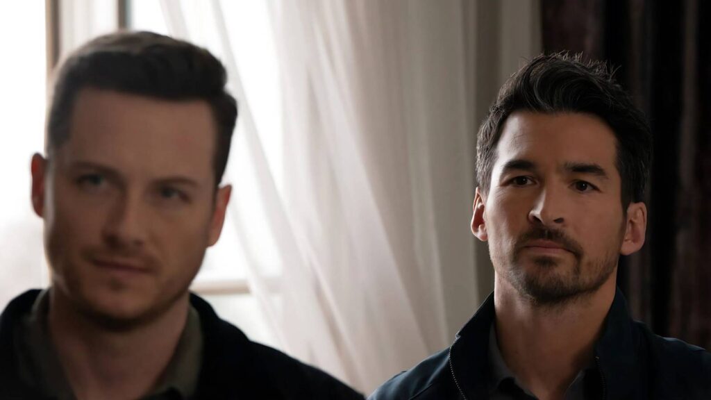 Лука Клейнтанка в роли Скотта Форрестера, истекающего кровью из переносицы, и Картера Редвуда в роли Эндре Рейнса, выражающего беспокойство в FBI: International.