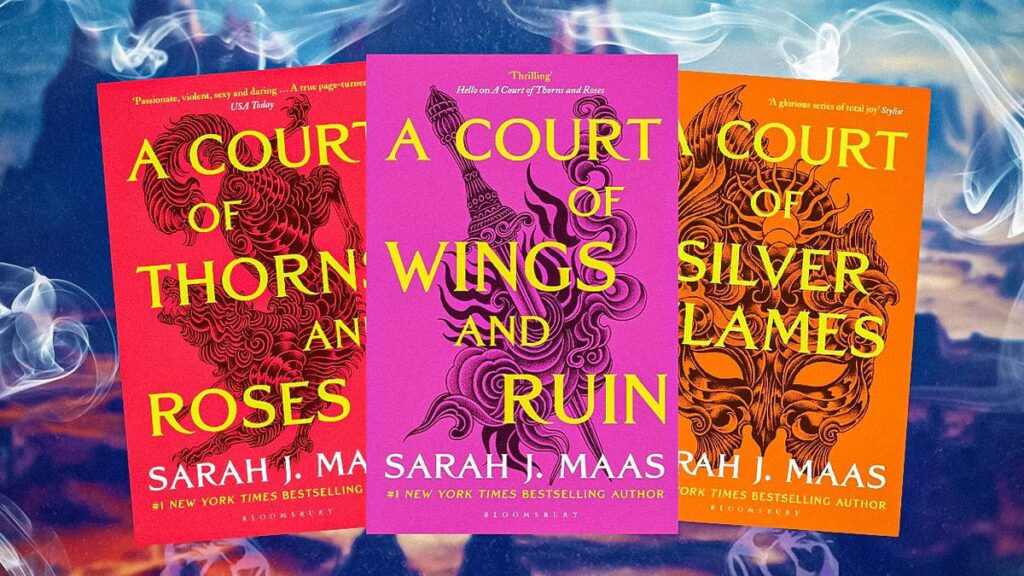 Степка книг «A Court of Thorns & Roses» Сары Дж. Маас на фоне яркого цвета