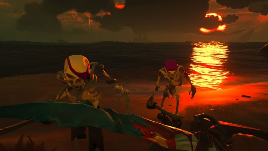 Скриншот геймплея Sea of Thieves на PS5, призрачные пираты, скелеты, красивые океаны и пейзажи.