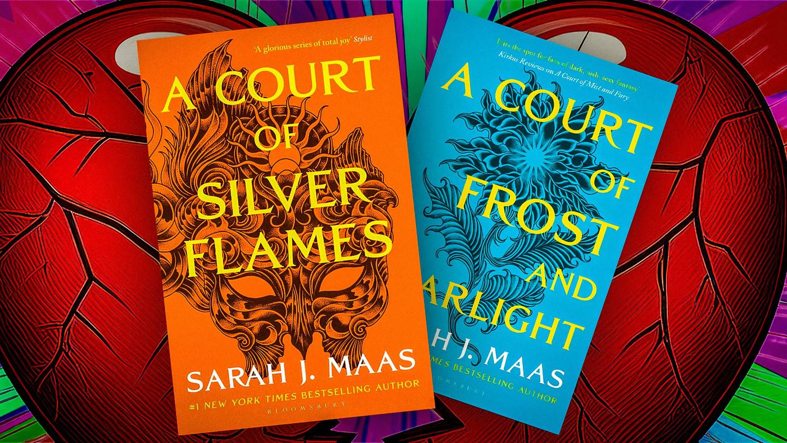 Обложки книг серии "Court of Thorns and Roses" Сары Дж. Маас на фоне смайликов