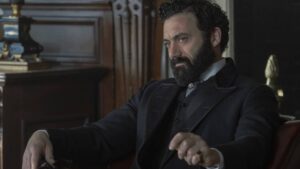 Ультро, сыгранный Джеймсом Спейдером, смотрит на Капитана Америку, сыгранного Крисом Эвансом, внутри поезда в фильме «Мстители: Возрождение Олутора»