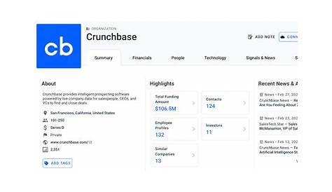 Crunchbase — это ваш источник для прогностической разведки частных компаний. Визуально анализируйте данные компании прямо на страницах профиля, включая финансирование. Crunchbase — это онлайн-платформа, которая предоставляет информацию о компаниях и стартапах, включая информацию об инвестициях и финансировании, руководящих должностях и корпоративных новостях.
