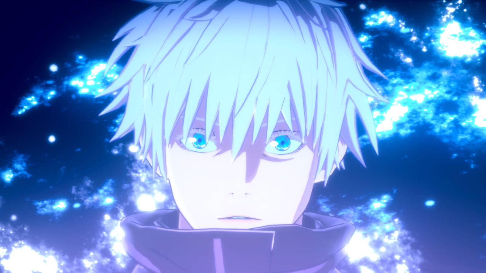 Скриншот из редкого кат-сцены Jujutsu Kaisen Cursed Clash показывает, как Годжо готовится запустить большую, светящуюся фиолетовую сферу.