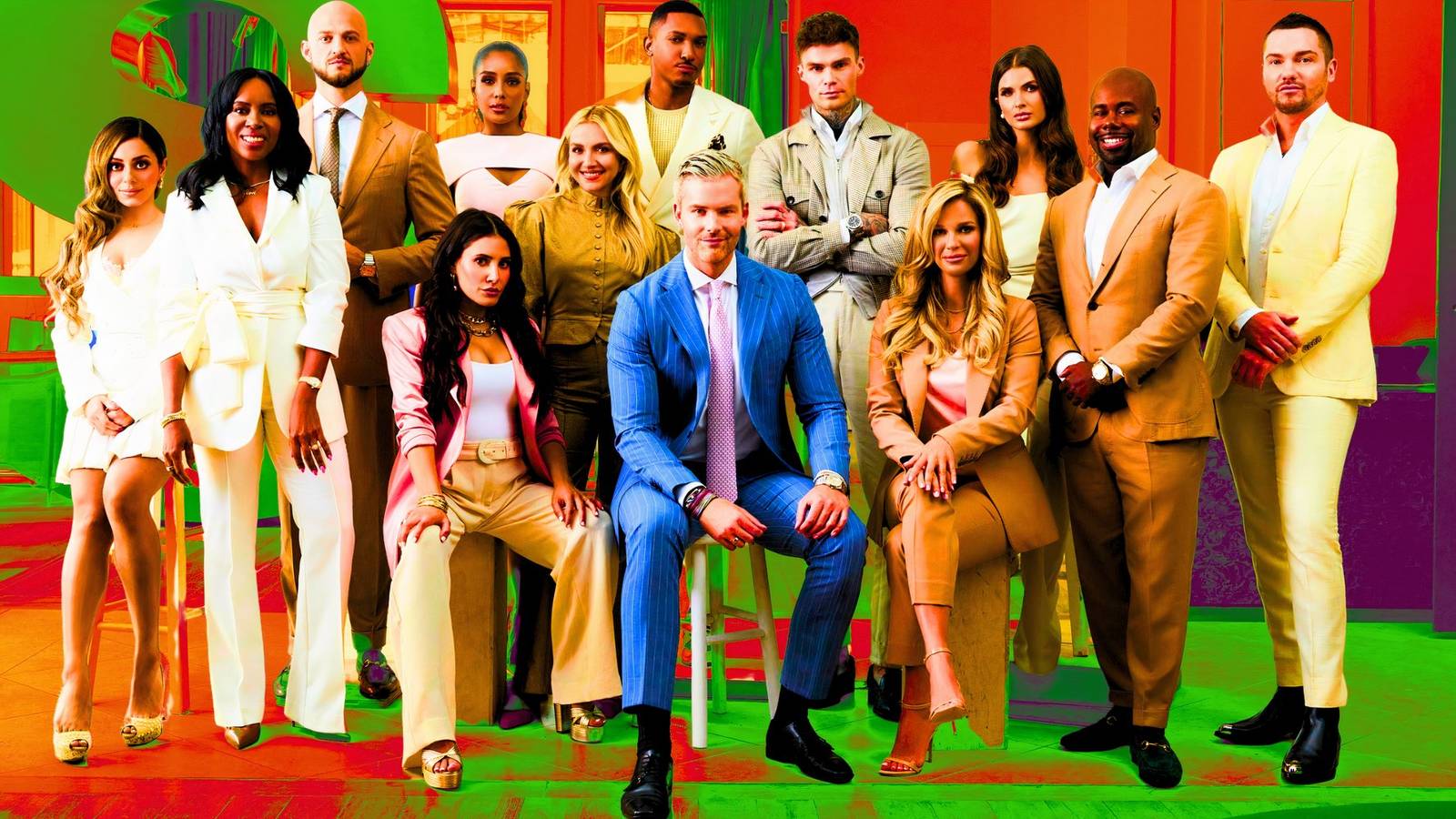 Звезда "Million Dollar Listing New York" Райан Серхант в монтаже с двумя разными позами и синим и оранжевым фоном