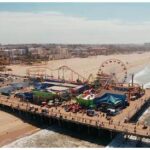 Вертолет Санта-Моника закружился над воздушным пирсом Лос-Анджелеса сверху в красивом месте