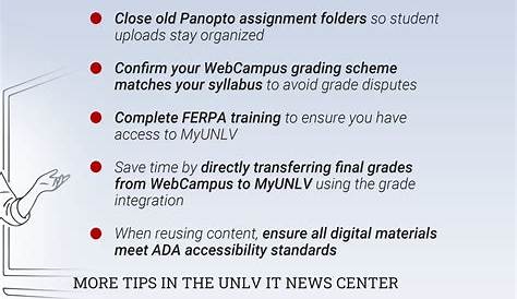 Студенты используют веб-кампус для доступа к курсовой работе, размещенной инструкторами, отправлять задания. Webcampus (на основе холста) является системой управления обучением unlv.
