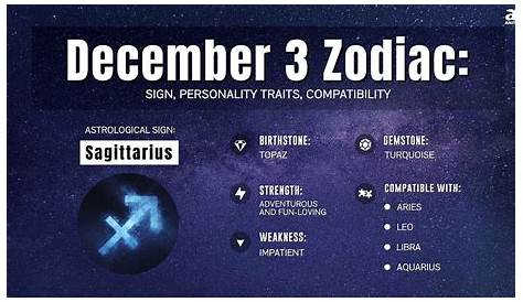 3 декабря знак зодиака и значение вашего дня рождения показывает, что вы родились в период, который обозначен для уроженцев Стрельца, который бывает. Каждый знак зодиака имеет свои сильные и слабые стороны, поэтому научитесь работать со своим. 3 декабря зодиак как Стрелец, родившийся 3 декабря, ваша личность определяется вашей напористой, беспокойной и открытой природой. Люди, родившиеся 31 декабря, являются частью знака зодиака Козерога — выдающегося астрологического знака, известного своей способностью создавать баланс.